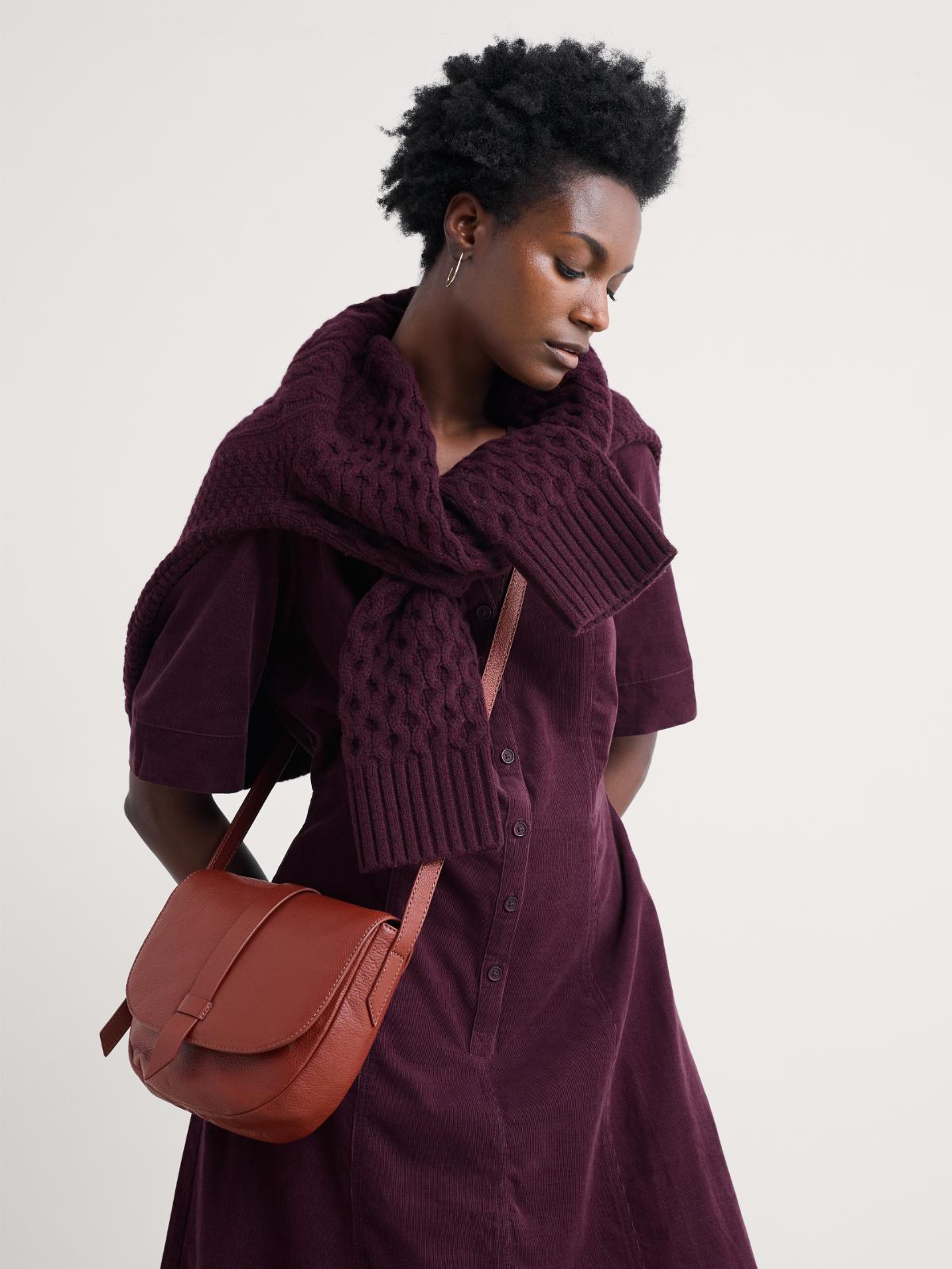 „Wenn Sie sich vor dunklen Tönen scheuen, setzen Sie auf helles Layering – z. B. ein brauner Pullover mit bordeauxfarbenem Rock und einem beigen Schal.