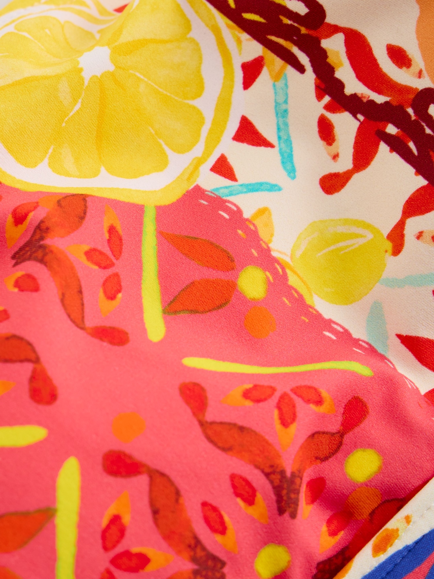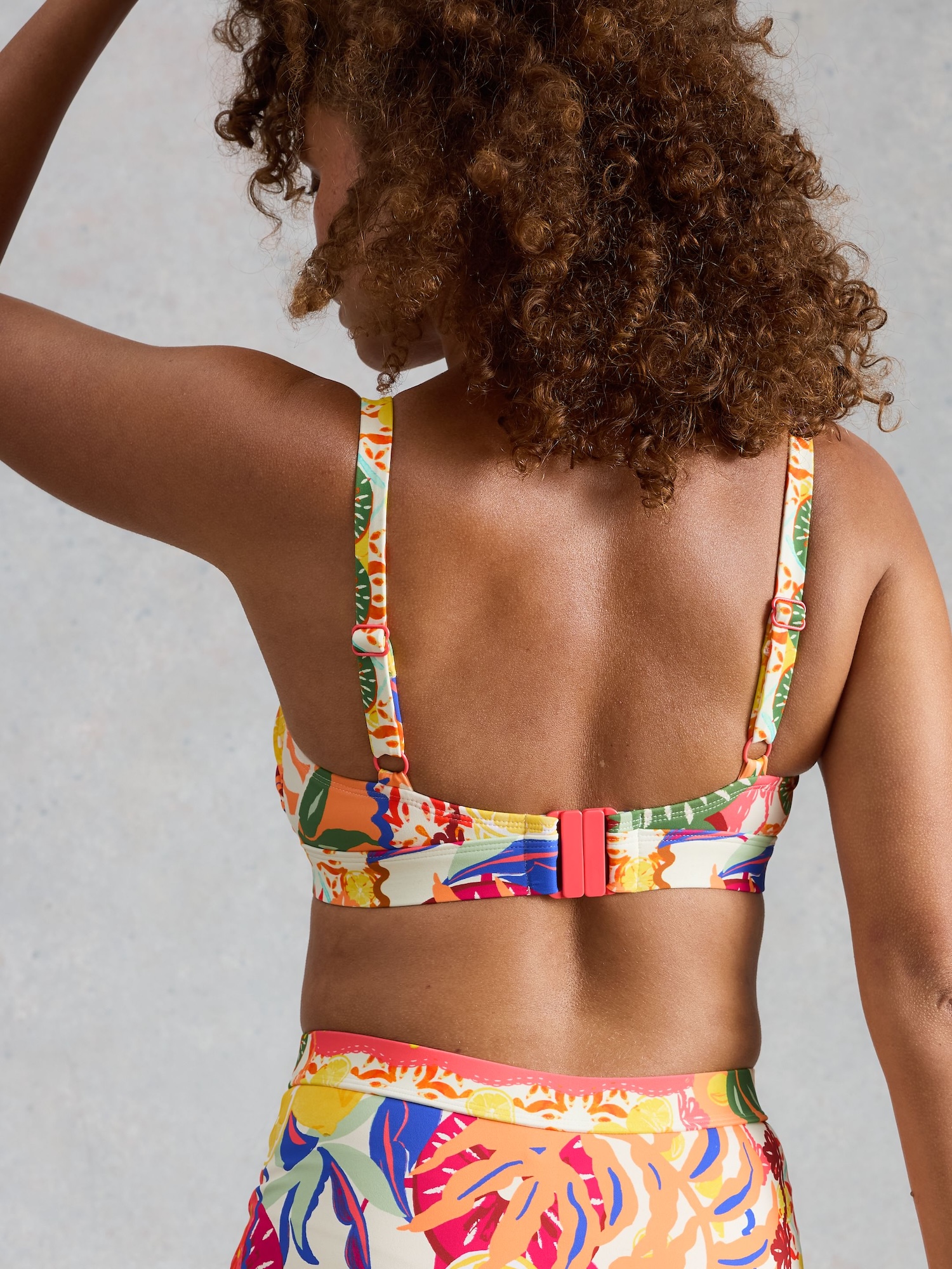 Das bunte Bikinioberteil hat einen geraden Schnitt und einen frischen Print. Dank Futter und elastischem Material trägt es sich angenehm und behält seine Form.