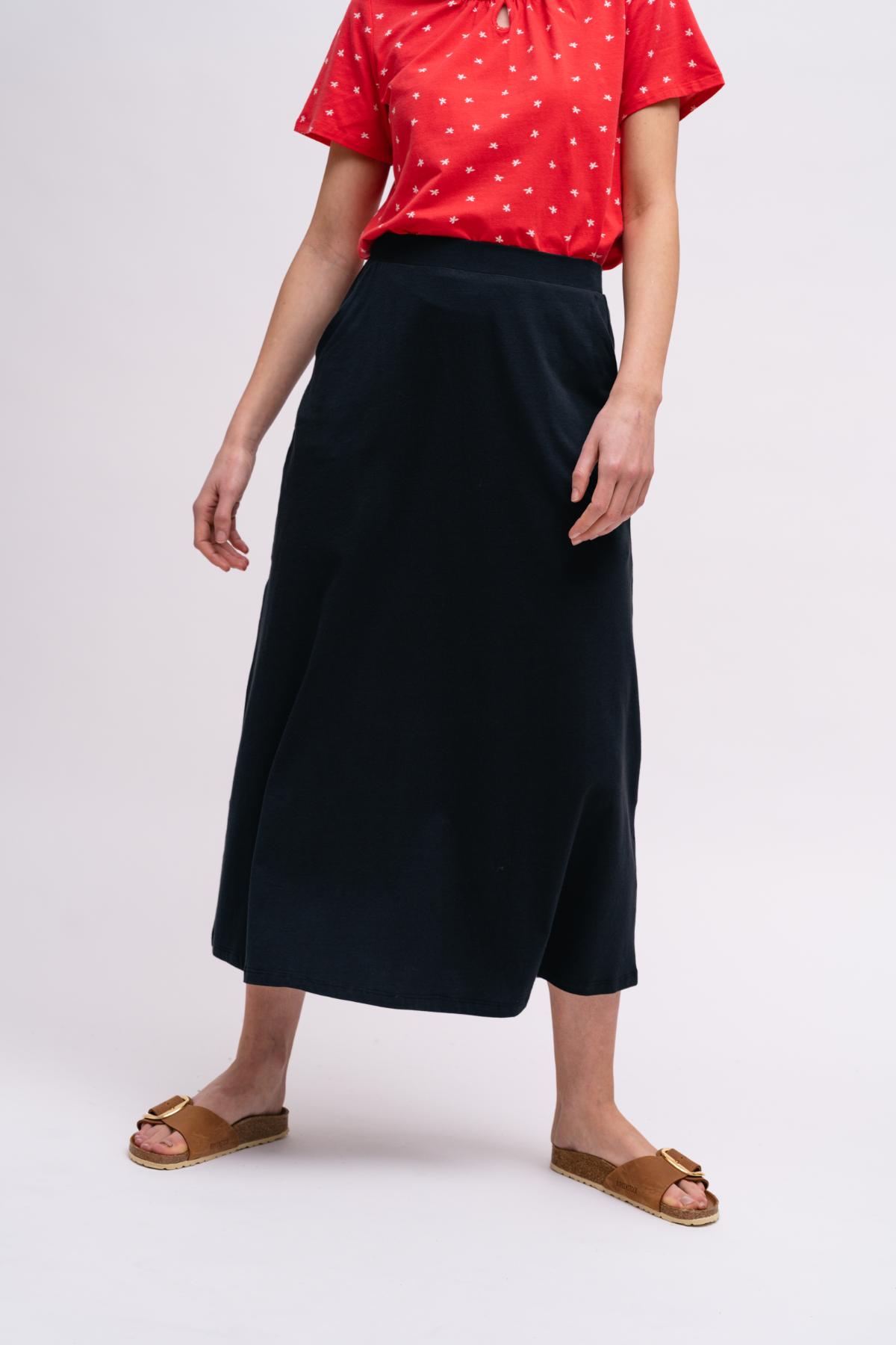 Der schwarze A-Linien-Rock reicht bis zur Wade und wirkt elegant. Taschen und ein komfortabler Bund erleichtern das Styling im Alltag.