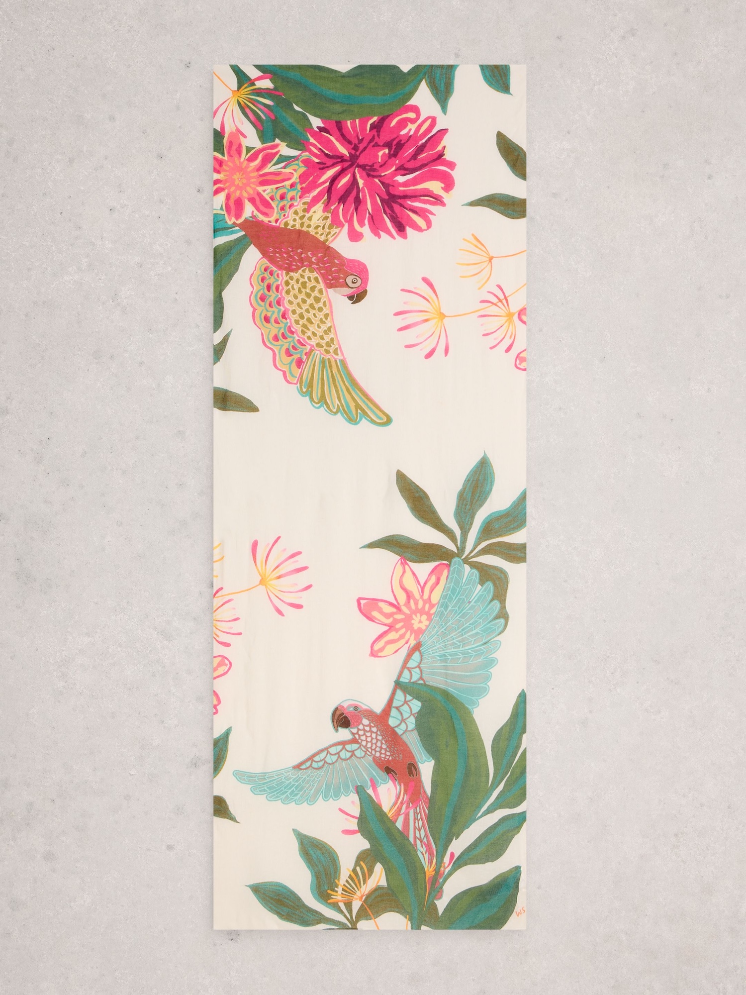 Luftig und farbenfroh – dieses Tuch setzt sommerliche Akzente. Hergestellt aus Bio-Baumwolle, Viskose und Leinen; Maße 180 x 70 cm.