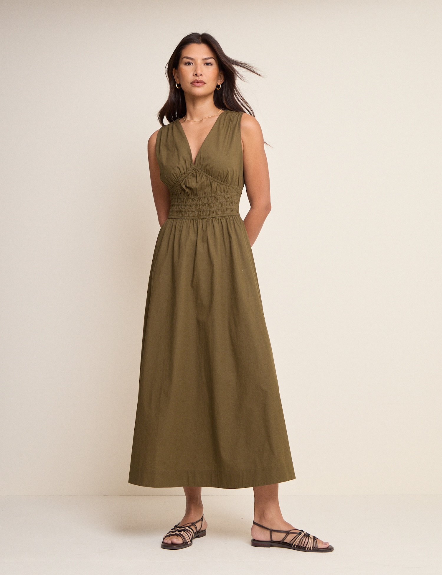 Leichtes Maxikleid in Khaki mit figurbetontem Oberteil und weitem Rockteil, passend für den Alltag und festliche Anlässe. Das Material besteht aus 100 % Baumwolle und trägt sich angenehm.