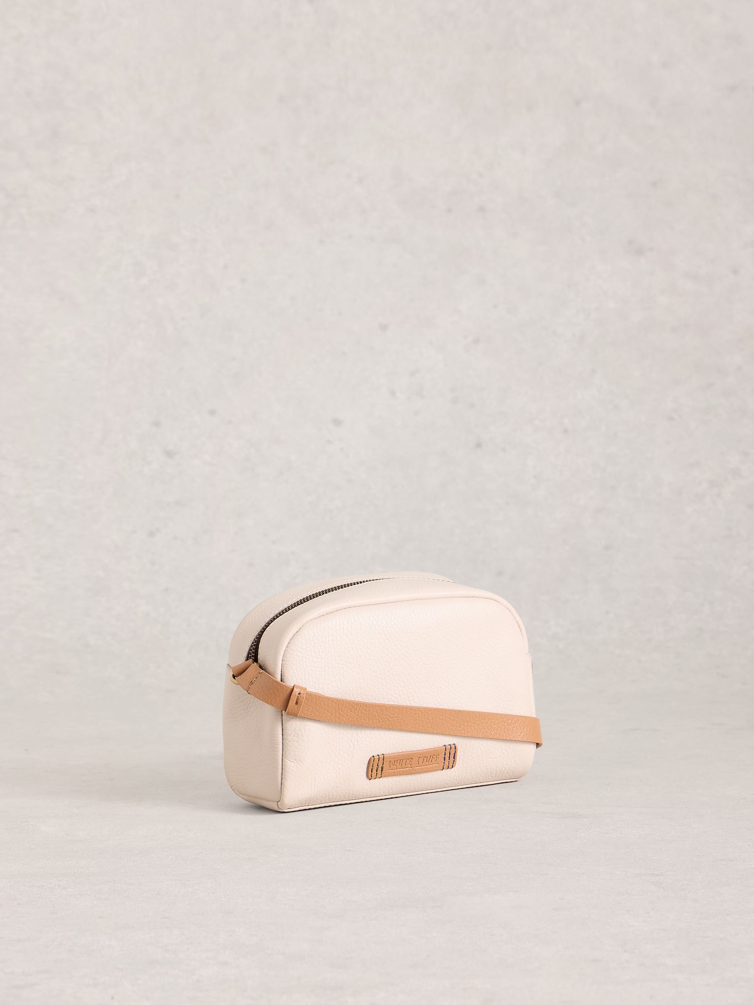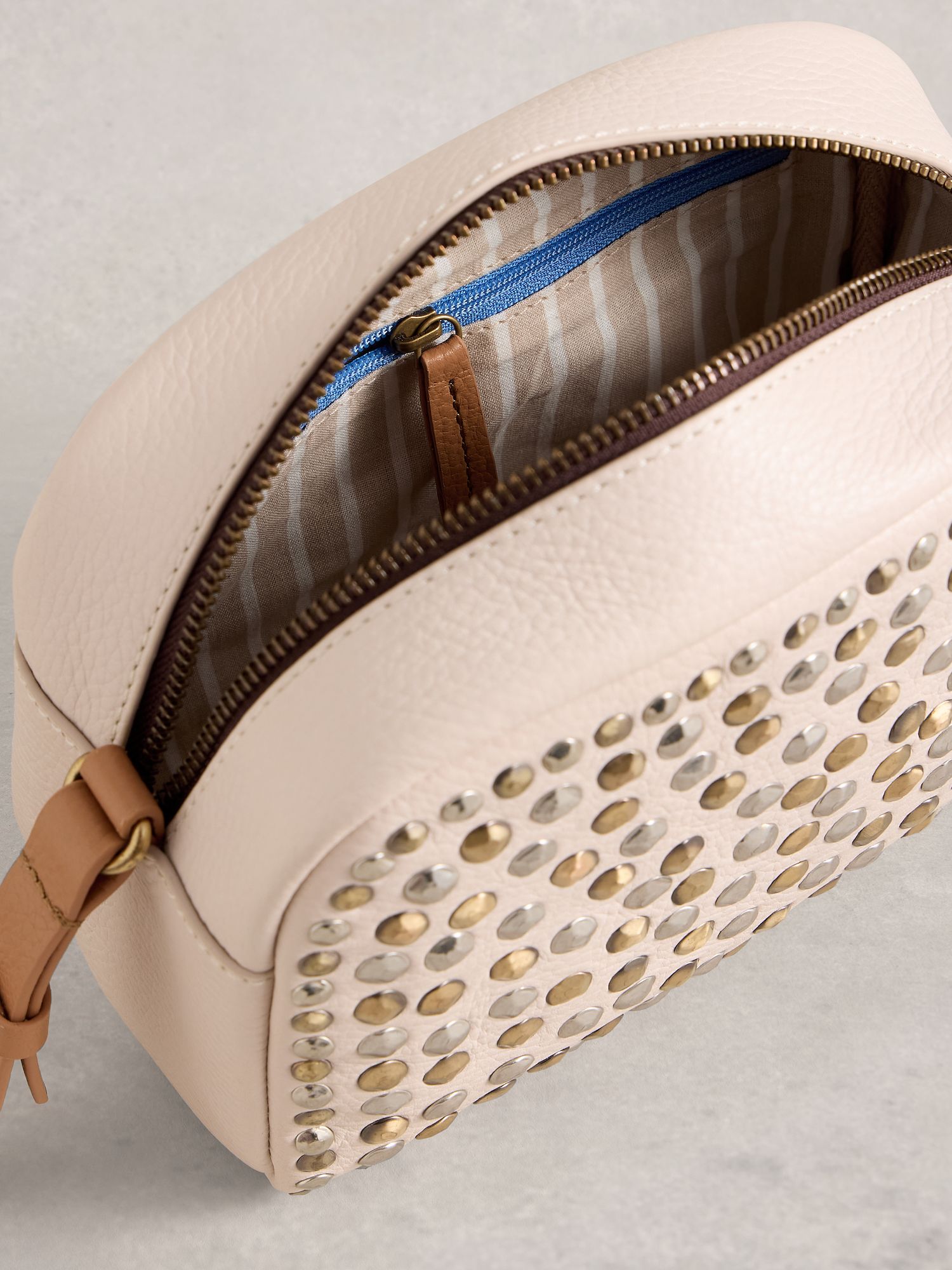 Kompakte Ledertasche in Elfenbein mit auffälligen Nieten. Innen sorgt ein Baumwollfutter mit Reißverschlussfach für Übersicht und Ordnung.
