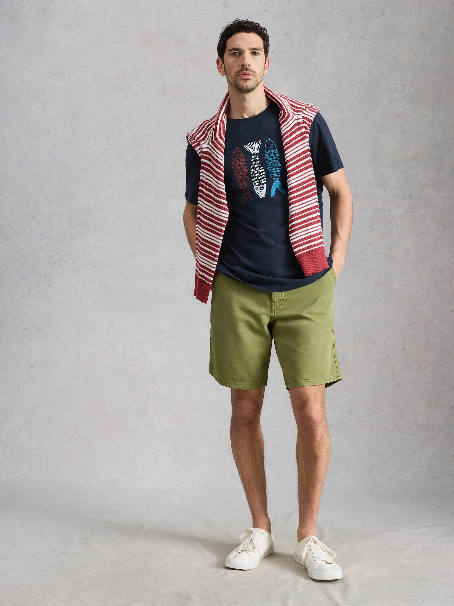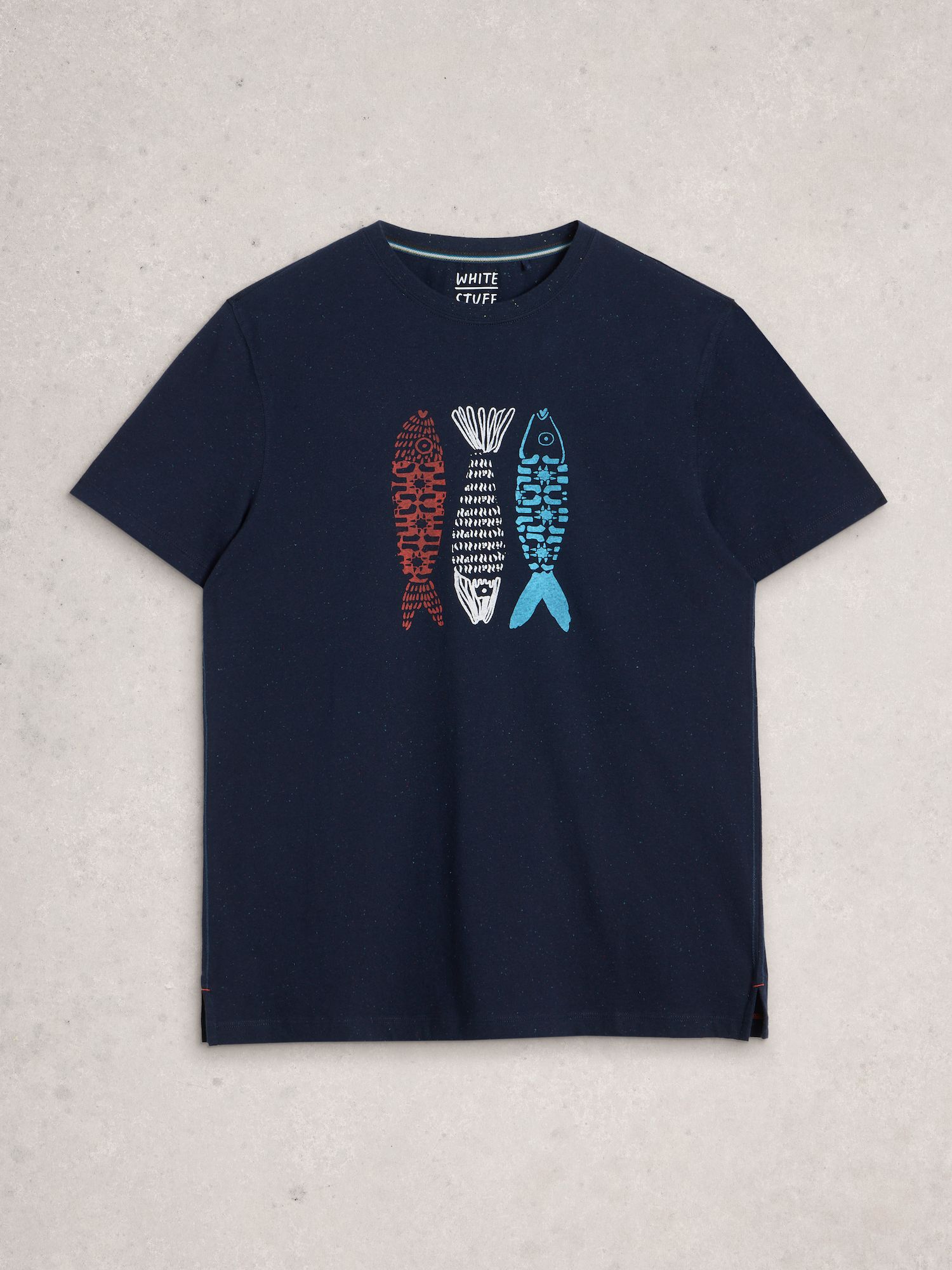 Navy-T-Shirt mit verspieltem Druck von drei Fischen auf der Brust. Der gerade Schnitt aus Fairtrade-Baumwolle sorgt für angenehmen Tragekomfort im Alltag.