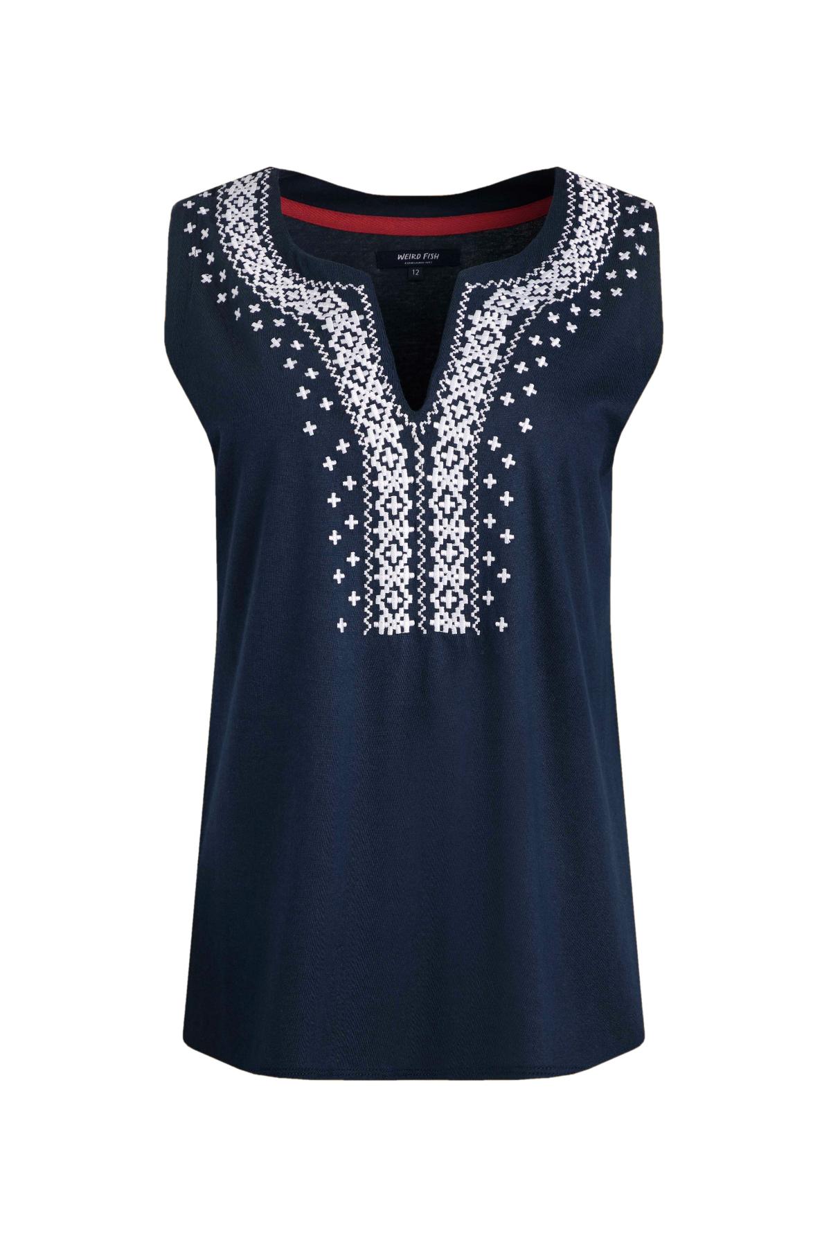 • originelle Stickerei im Dekolleté